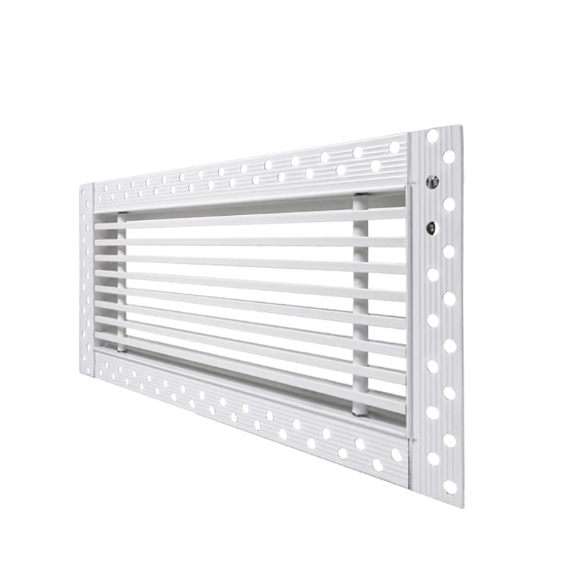 Данная решетка подходит для монтажа на любую поверхность под финишную отделку. Рамка и экран изготовлены из алюминия, опора экрана - из оцинкованной стали. Рама оснащена «полкой» 1,9 мм и рифлеными краями для большей адгезии финишного материала – шпатлевки, цемента. Решетка имеет съемную центральную часть с фиксированным углом наклона ламелей 0°. Она крепится к корпусу прочными металлическими тросиками, легко снимается для очистки и удобного обслуживания.