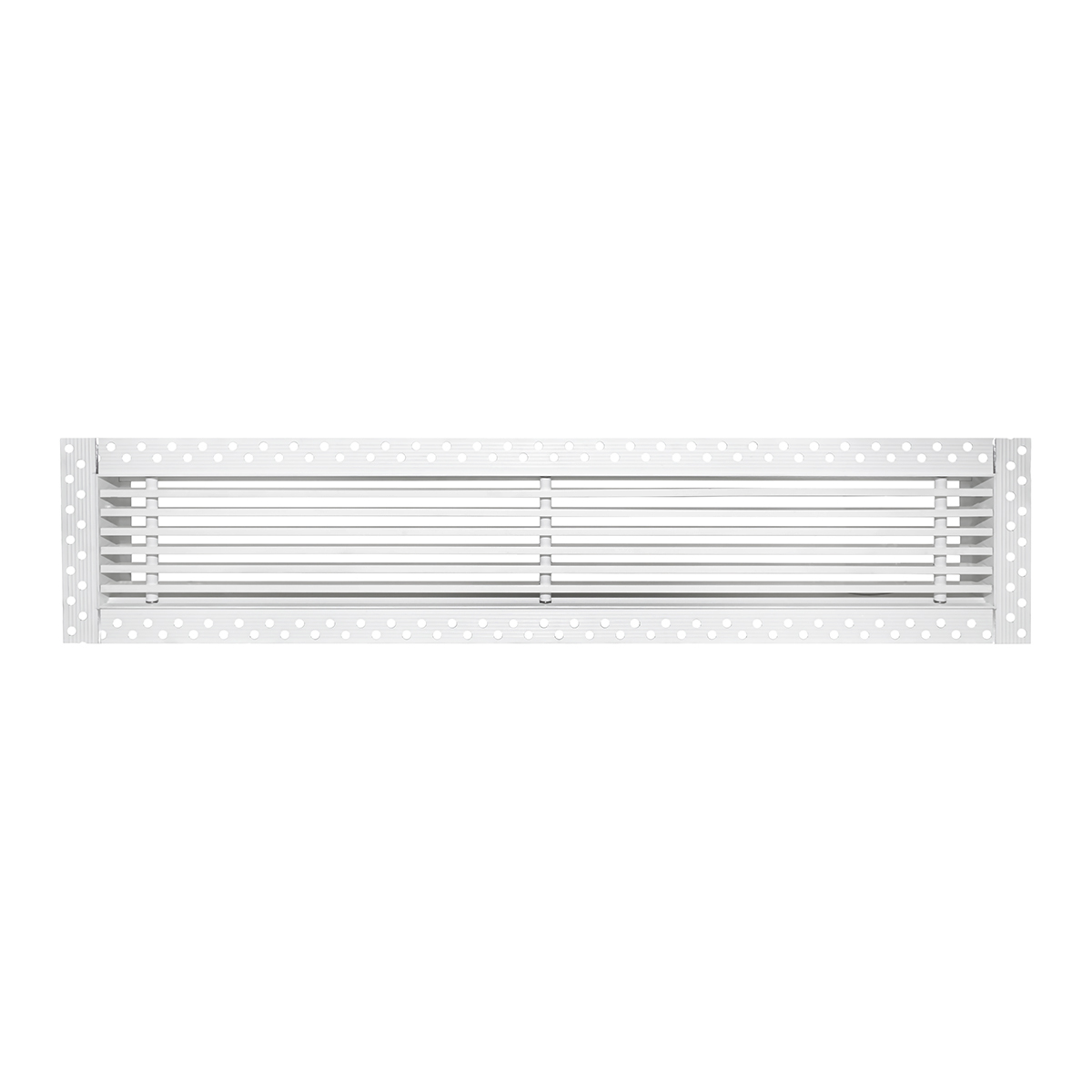 Данная решетка подходит для монтажа на любую поверхность под финишную отделку. Рамка и экран изготовлены из алюминия, опора экрана - из оцинкованной стали. Рама оснащена «полкой» 1,9 мм и рифлеными краями для большей адгезии финишного материала – шпатлевки, цемента. Решетка имеет съемную центральную часть с фиксированным углом наклона ламелей 0°. Она крепится к корпусу прочными металлическими тросиками, легко снимается для очистки и удобного обслуживания.