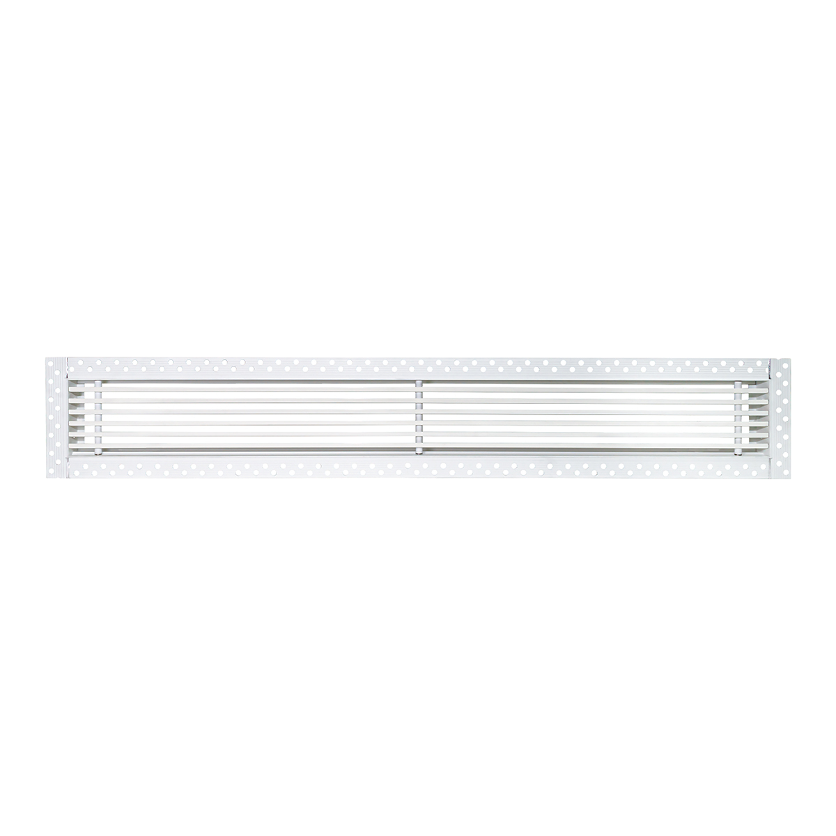 Данная решетка подходит для монтажа на любую поверхность под финишную отделку. Рамка и экран изготовлены из алюминия, опора экрана - из оцинкованной стали. Рама оснащена «полкой» 1,9 мм и рифлеными краями для большей адгезии финишного материала – шпатлевки, цемента. Решетка имеет съемную центральную часть с фиксированным углом наклона ламелей 15°. Она крепится к корпусу прочными металлическими тросиками, легко снимается для очистки и удобного обслуживания.