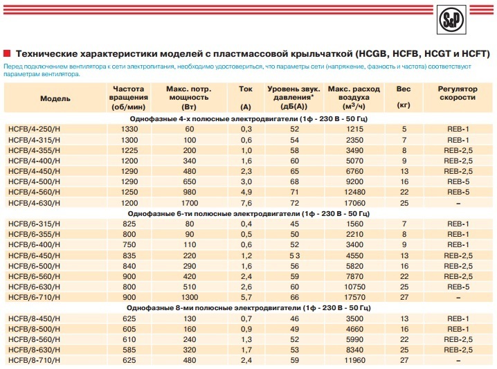 В зависимости от модели, вентиляторы комплектуются 2, 4, 6 или 8 полюсными однофазными электродвигателями.