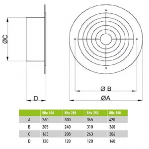 Вытяжные осевые вентиляторы ВН могут использоваться в кухне, ванной и офисе для удаления пищевых и нежелательных запахов, сигаретного дыма и загрязненного воздуха. Они легко монтируются на окнах и стенах. Корпус произведен из листового металла с покрытием электростатическим порошком. Крыльчатка произведена из листовой стали толщиной 0,60 мм или алюминия, что обеспечивает сильную циркуляцию воздуха в тишине.Корпус двигателя был произведен методом алюминиевого литья. В подшипниках ротора использованы металлизированные стыки, обеспечивающие бесшумную работу двигателя.
